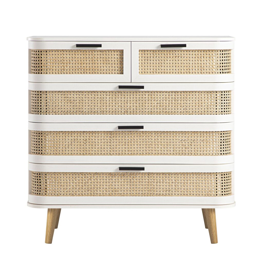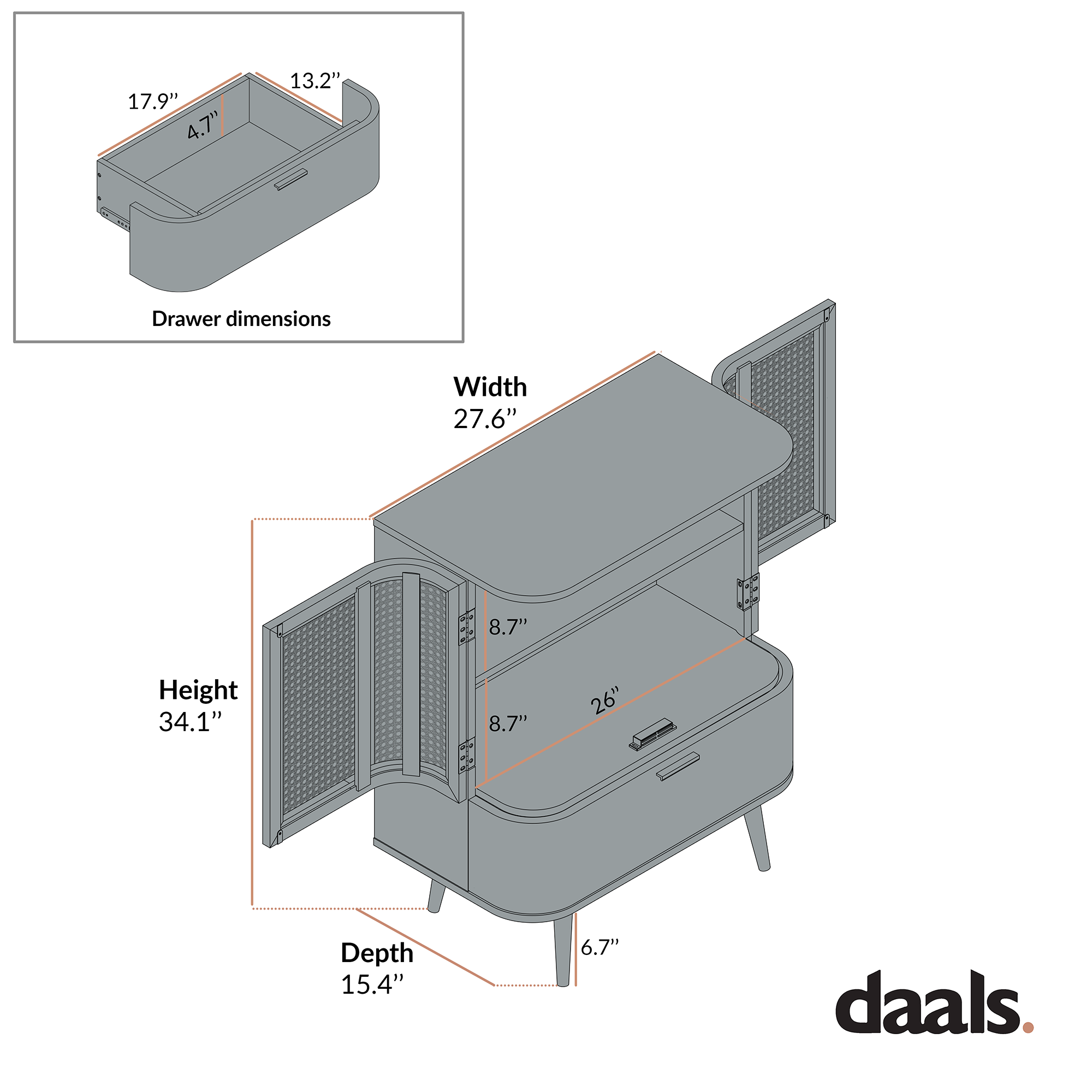• Featuring a deep walnut effect finish and natural rattan doors, it brings a refined, earthy charm to smaller spaces.